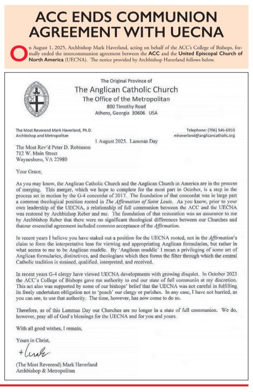 In an essay published in the September-October 2025 issue of The Trinitarian, Abp. Haverland stated that when he and Bp. Reber signed the agreement, there was assurance that there was no significant doctrinal disagreements, and that Bp. Reber had hoped that UECNA would eventually join the ACC. However, tensions and differences — theological, canonical, and institutional accumulated since then. In the letter of Abp. Haverland, which was quickly posted on Facebook and then officially published in the September-October issue of The Trinitarian, UECNA was judged to have diverged from the doctrinal standards embodied in the Affirmation of St. Louis and instead was using “some set of Anglican formularies, distinctives, and theologians” as an interpretive lens.